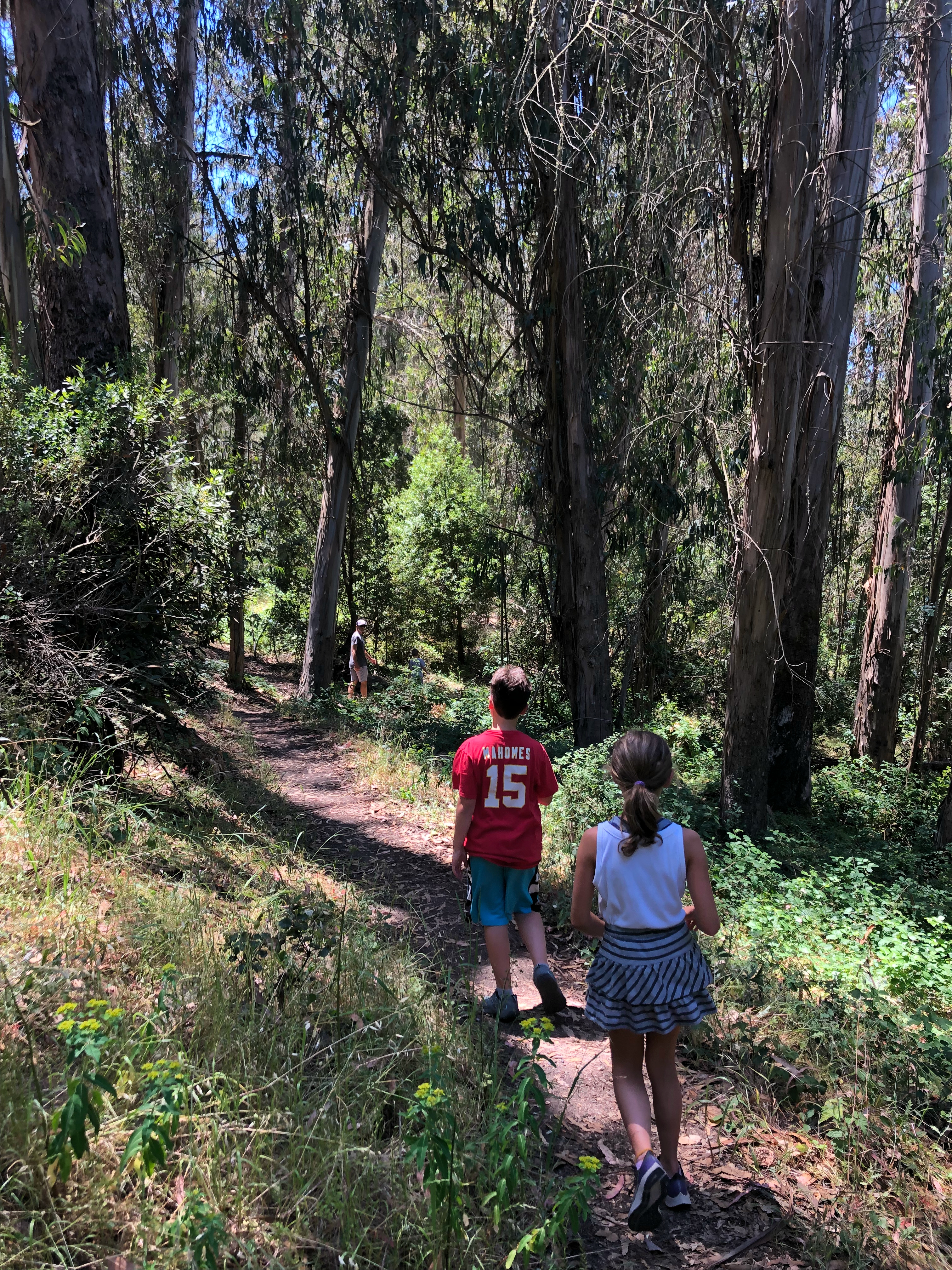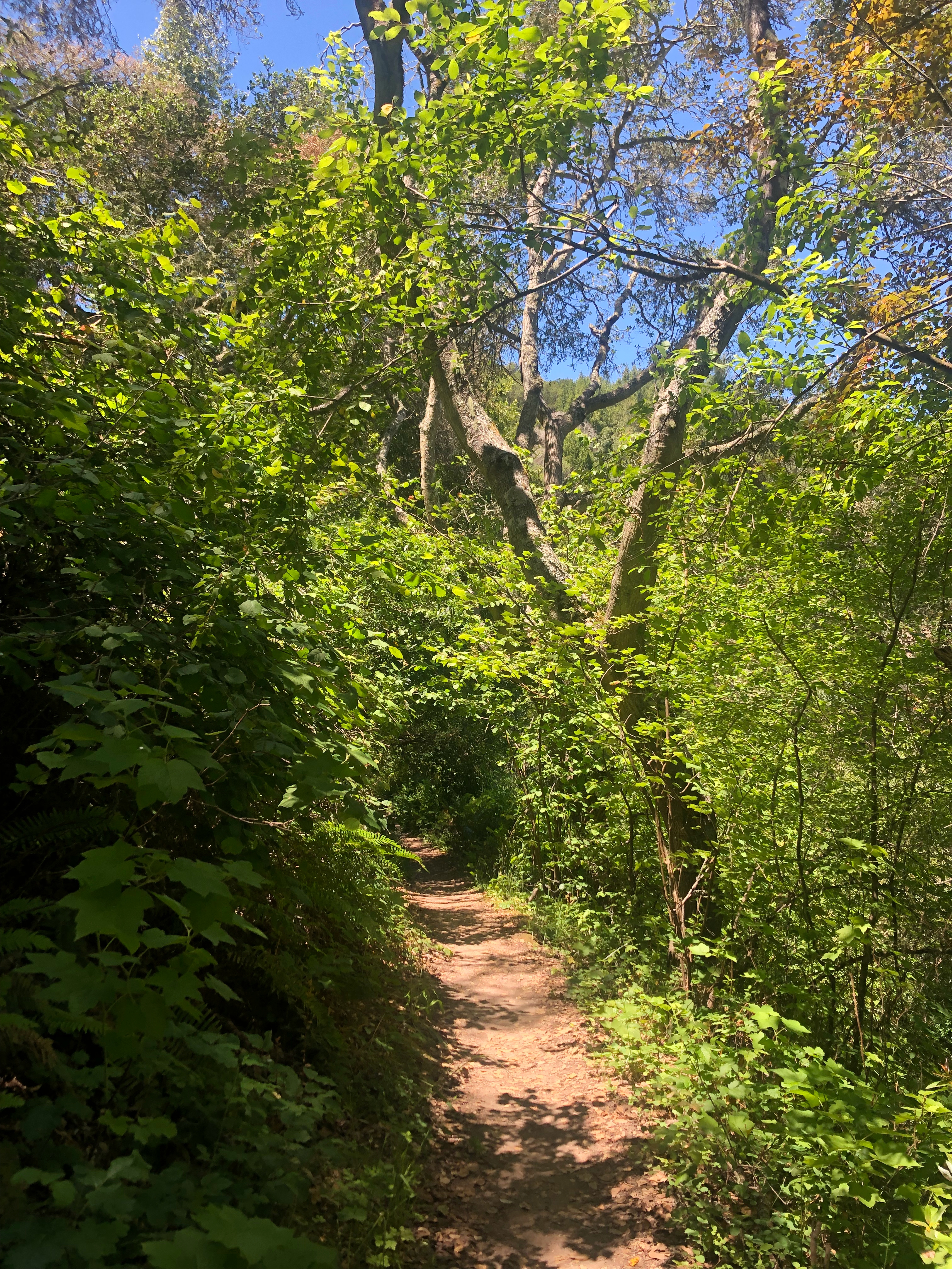 We hiked this approximately 2.8 mile hike on Memorial Day, naming it the “Memorial Day Hike” because it begins on Memory Trail. This trailhead is marked with a wooden staircase in the middle of the road on the north side of Canon Drive (Google map to 663 Canon Drive, Kensington, or Canon Drive and Central Park Drive). You can park here on the side of the road. Note – some of the trails on this hike are narrow, and there is poison oak all around to be mindful of.