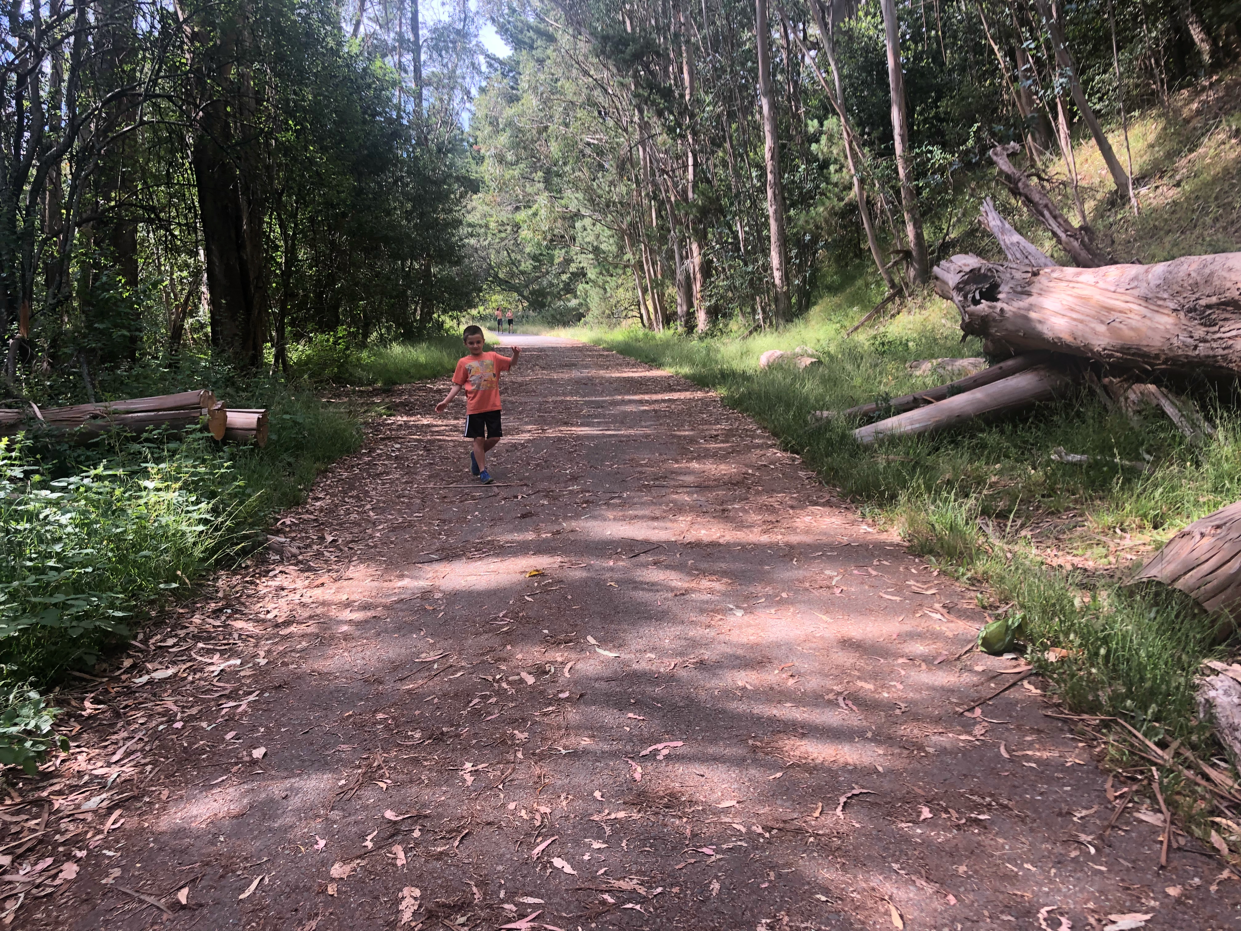 The hike up to Vollmer Peak is an easy one tucked behind the Steam Trains. Had the trains been open, we would have taken a ride before and after walking up to the peak. Park in the Tilden Steam Train overflow lot, and begin on the Seaview Trail, which is well marked on the east side of the lot. You can make this a very short, less than 2 mile hike, by simply following this paved road right to the top! We extended this hike to make it approximately 2.4 miles, by taking the Seaview Trail, turning left onto the Lupine Trail and then shortly thereafter turning onto the Vollmer Peak trail which ultimately picks up at the paved road again, taking you to the peak. At the top is a large space, which you can loop around to have a pretty view of the bay area. The boys liked the large climbing tree there, too! There is a communications tower there as well, which detracts from the beauty surrounding it. We followed the paved road all the way back down, making this a lollipop hike.